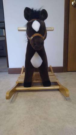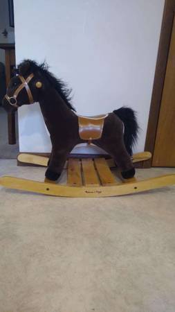 Gently used Melissa & Doug brand plush Rock and Trot Horse. Made for ages 2+, this pony has a 150lbs capacity, built with solid wood (handles included) of course excluding the soft and snuggly...