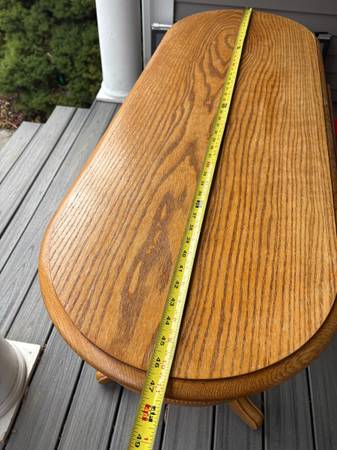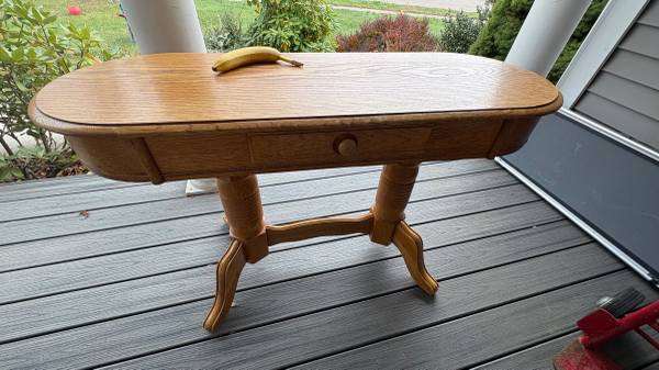 Sturdy solid oak table with center drawer, circa 2004(?). Would have said “used - like new”, but noticed slight crazing in finish (most people wouldn’t notice or care, but just wanted to be up front about it). Banana for scale..