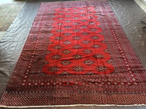 A vintage Pakistani Rug, a Bokhara Jhaldar, in good clean condition with a few small worn spots (see photos). Hand-knotted wool on cotton foundation. The Pakistani Jhaldar is a densely knotted rug, yet the rug is thin and flexible. It might need a rubber mat underneath. The folding creases will disappear. Typical Bokhara design with Elephant foot prints, called Guls. Bright red color. Typical Turkman borders in orange and black. Size 9'2" x 5'11".