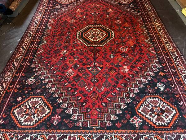 A beautiful large Persian rug, a vintage Shiraz, in good condition, with some wear. Hand knotted, wool on cotton foundation. Thick and flexible pile, feels like a thick blanket. Typical Shiraz design, warm opulent colors of mineral and vegetable dyes. Shiraz carpets (Persian: قالی شیراز) is a type of Persian rug made in the villages around the city of Shiraz, in the Iranian province of Fars. They resemble the common grandeur of all Persian rugs. Size 9'-10" x 7'-3".