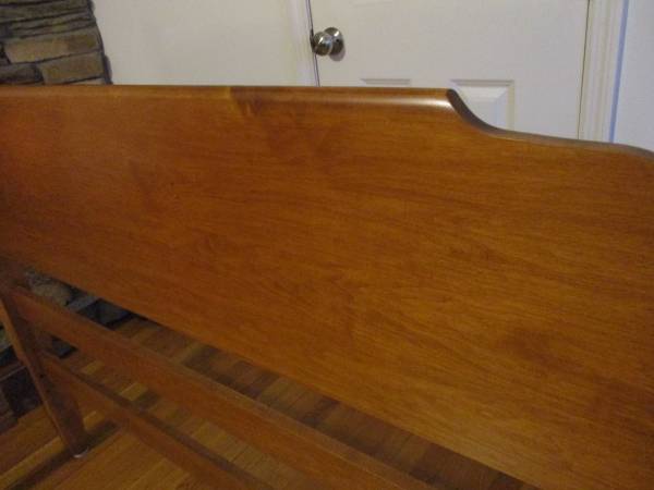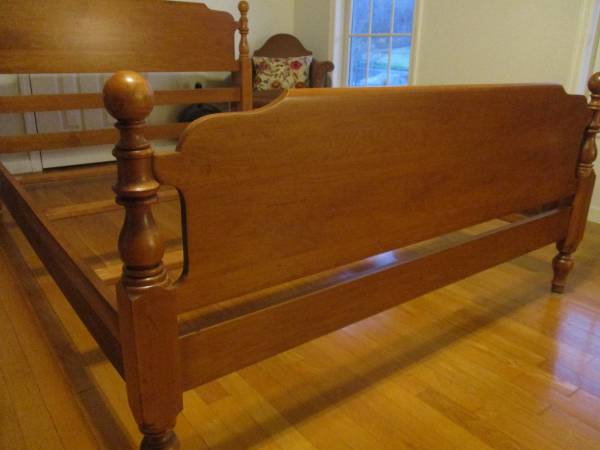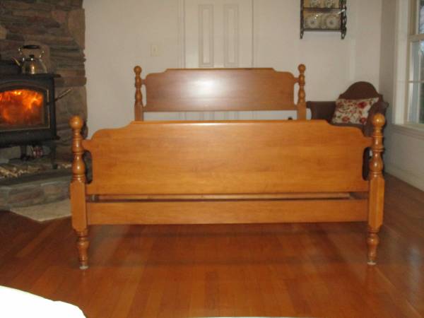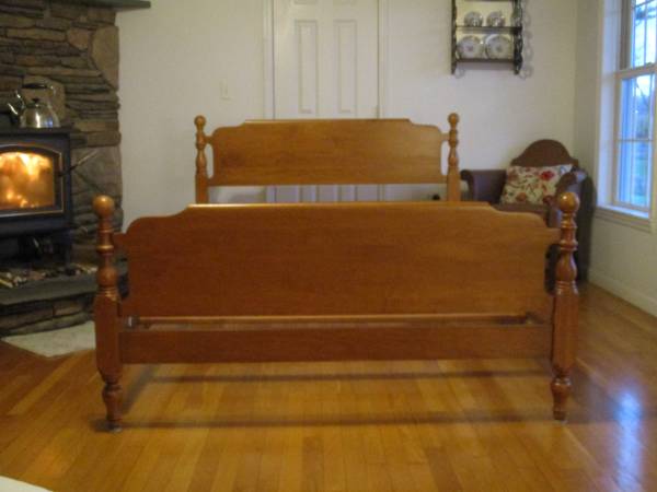Maple bed frame in full, or double size. It is completely sturdy and solid, heavy duty. The headboard posts measures 40" high; the footboard posts also measures 29" high. Exceptional quality. All solid hardwood. No particleboard, press wood or softwood. It looks so much nicer than our pictures show! It is in absolutely perfect, like new condition all throughout. Please call 802 five 2 seven zero 6 seven seven anytime or email with any questions. Thank you.