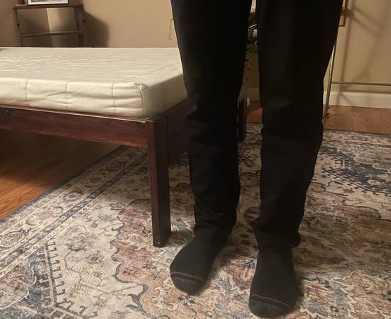 Twin Bed, solid pine, stained cherry. Platform bed (doesn't need a box spring). Rated to 180 pounds. Great as first "big kid" bed because it's low to the floor. See pic to show height.