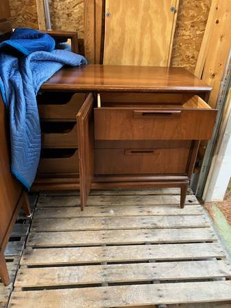 VINTAGE 1970'S SOLID HARDWOOD BEDROOM FURNITURE SET. SHORT WIDE DRESSER WITH LARGE MIRROR, TALL STANDARD DRESSER AND 2 MATCHING END TABLES. DOVETAILED JOINTS. IN GREAT CONDITION. $200 OBO ROSS...