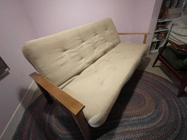 Clean and lightly used futon with metal frame and wood armrests. Full size mattress