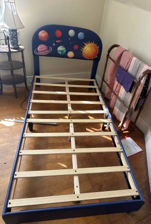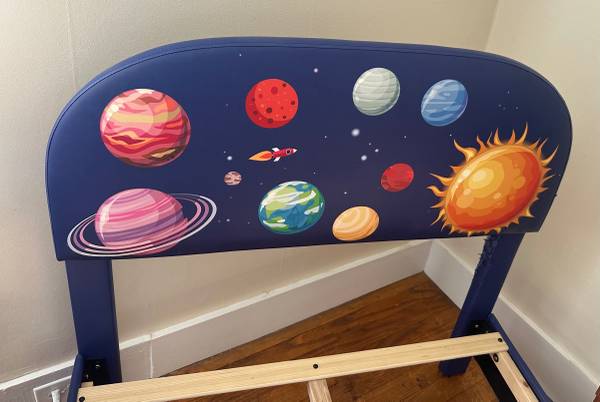 Twin bed frame with soft headboard with solar system design. Frame and slats are hardwood.