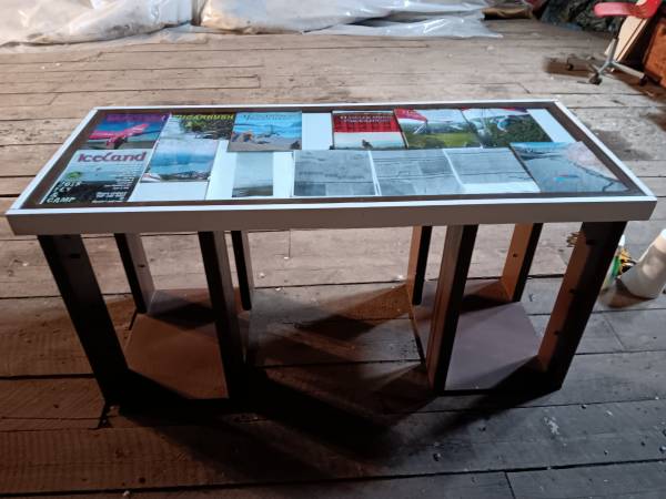 Glass-topped table. The current magazines underneath can be removed or replaced. 61 inches wide, 26 inches deep, and 31 inches high. Price: $20 To schedule a time to see it, please contact Steph at:...