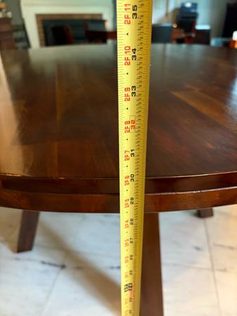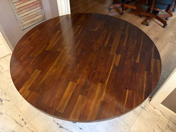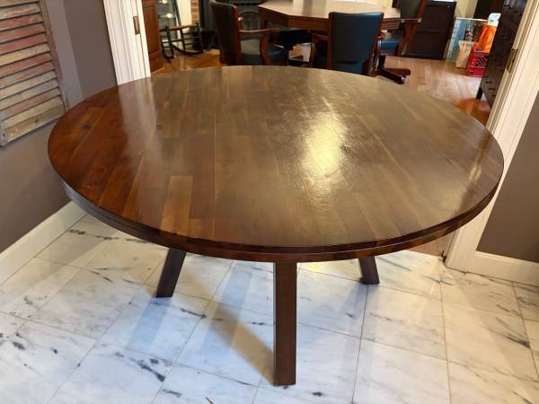 54” round hardwood dining table, 30” high. Beautiful walnut stain. Solidly built. $1200 new! Disassembles with hex wrench.