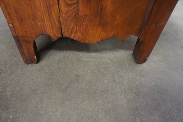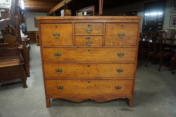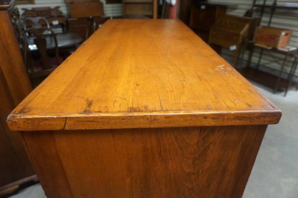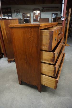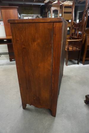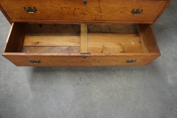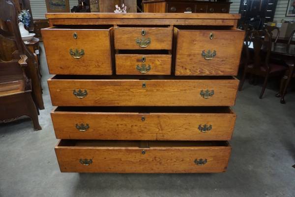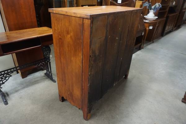 ref # 82A19 Good condition for it's age, old pine 16" wide boards with square nails and beautiful old dovetail, 10" deep drawers, finish is good, 49" tall 49" wide 21" front to back. .
