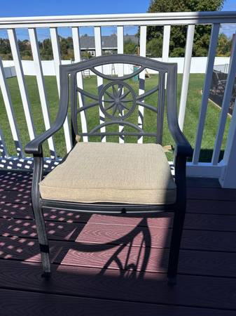 5 Piece Cast Aluminum Dining Set w/ 48 Inch Table by Darlee, "Ten Star" design. This set is made of cast aluminum, which doesn't rust. The chairs were stored inside every winter, and the table was stored under our deck with a cover over it. The cover is also included. The table has a hole in the center for an umbrella, or you can leave the cover in the hole (shown in these pictures) if you're not using an umbrella. The cushions for the chairs attach via velcro so they don't slide around.