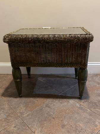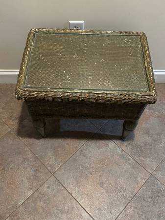 Whicker end table with glass top for sale in excellent solid condition. The table was painted brown with hues of green but could be easily repainted any color. The first photo represents the current...