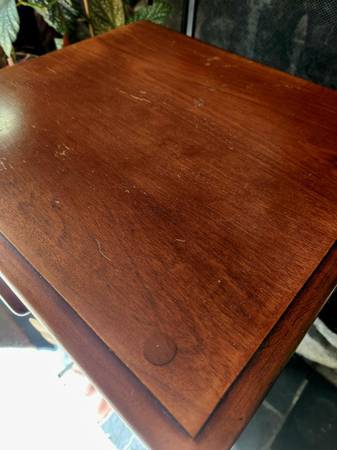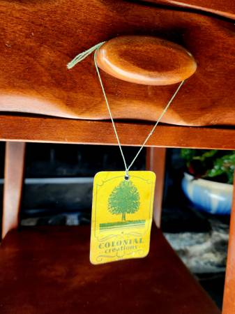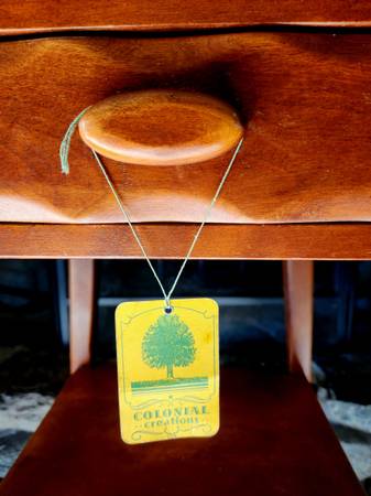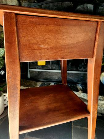 It features solid maple, a single drawer with a carved handle, a lower shelf, and splayed legs. The finish is original. There are a few minor surface scratches on the top and one leg has some horizontal scratches down low. Overall a beautiful rare piece. The price reflects the issues. Original tag too!