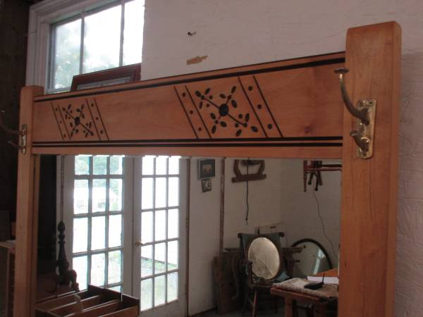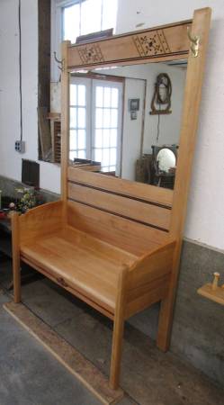 handmade entry bench, all reused materials, mostly antique bed frames. sanded to bare wood and 3 coats of semi gloss polyurethane. 45" wide x 20" deep x 77" tall. seat 18" high. $325 cash only. will...