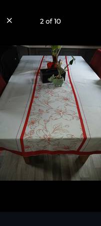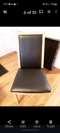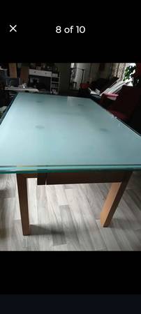 Beautiful table with glass top. Very heavy seat 6 people extends on ends to seat 10. Comes with 6 chairs. Reupholstered from a blue velvet to a black leather. Chairs have some wear and tear, fabric can be removed to go back to the blue or whatever you'd like. From a smoke free home, pet friendly home as the reason for some wear and tear on the chairs. Asking 300$ or best offer need gone