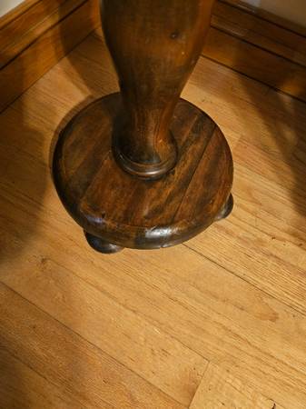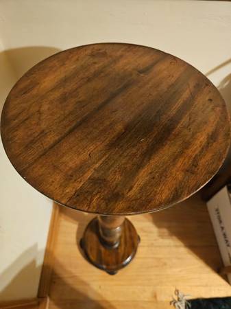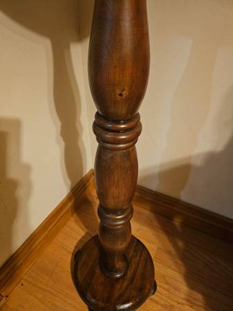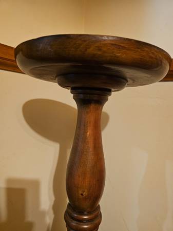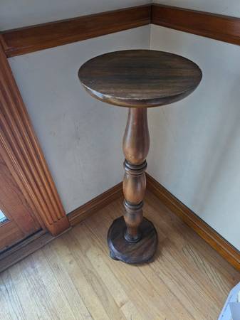 Handcrafted wooden pedestal plant stand. 3 feet tall. Bottom has a round base of 10" across. The top is round as well and 12" in diameter. Original dark wood finish display stand. Some wear and scratches to the finish. Good for fern display or for any other plant.