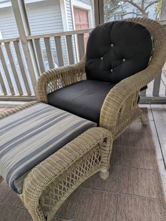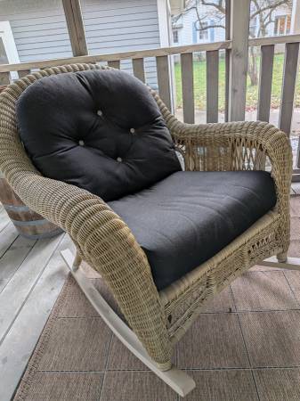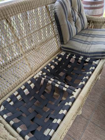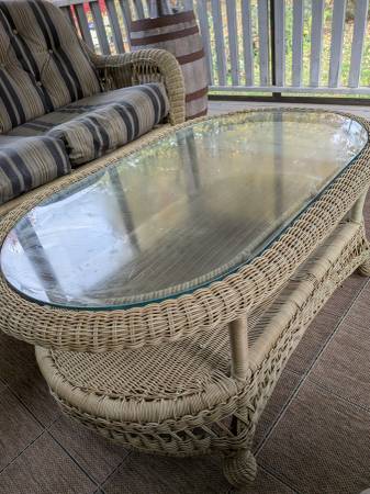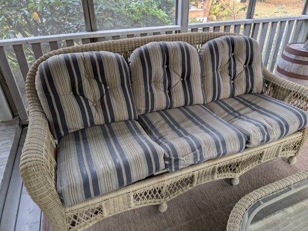 Complete porch set with cushions. Three seat couch, ottoman, rocker, chair and glass top table. Cushions and rattan are in great shape. Whole set has been on a covered porch so no rot. Webbing under cushions on couch is a little stretched out, but easily fixable. Rug also available for $50 more if wanted. Would love to keep this set, but downsizing and don't have a place for it anymore.