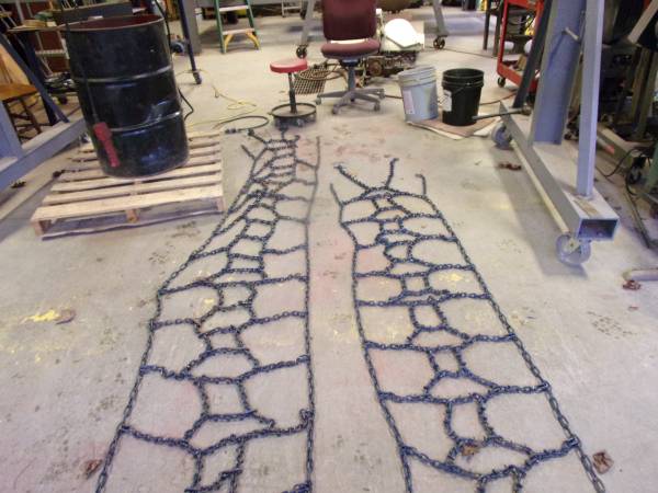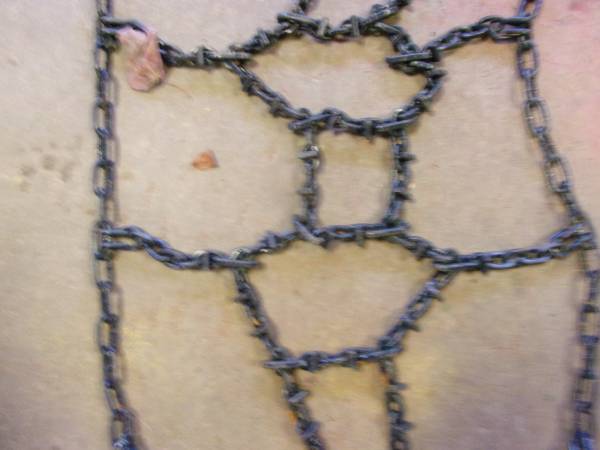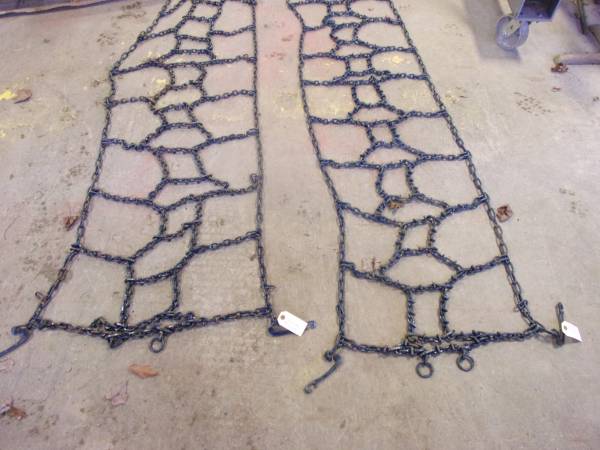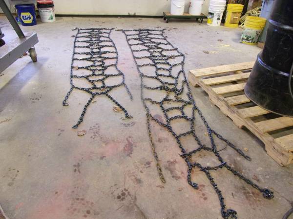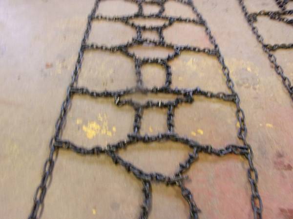 A pair of mis-matched new crossbar chains-- Smaller is 22" x 98" Larger is 24" x 126" These are reinforced lug chains With a little work someone will have a nice set of chains--Pictures show them well- I do not know what they fit- Measure your application and decide if they will work for you