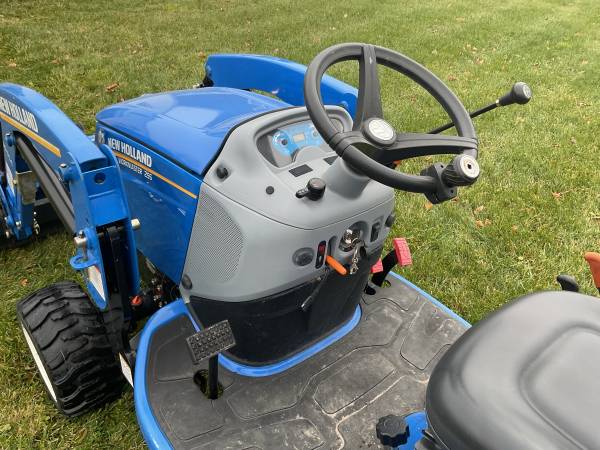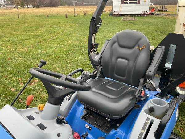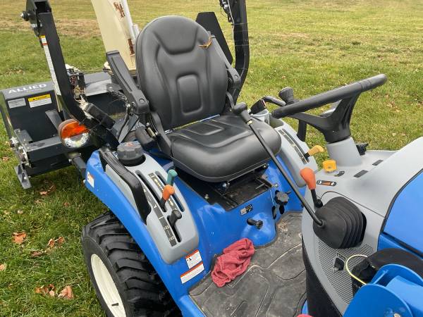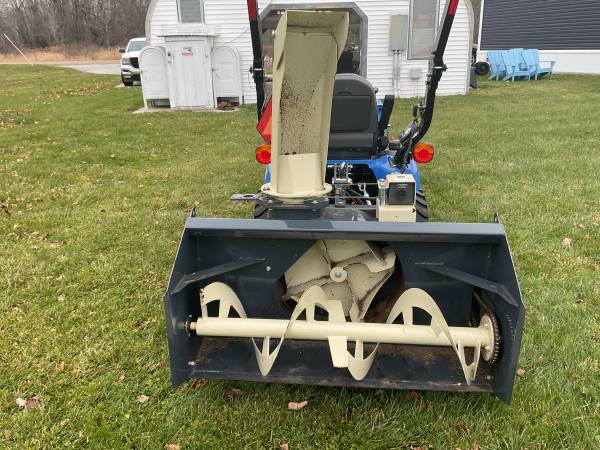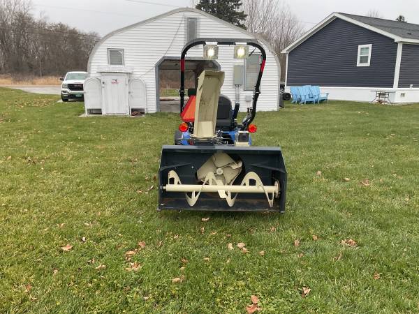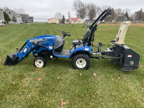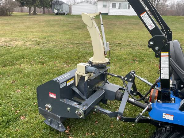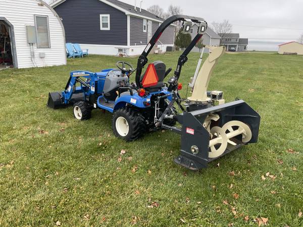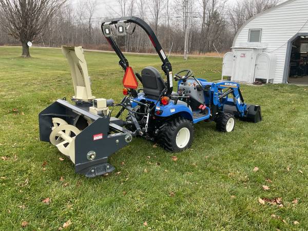 New Holland Workmaster 25s for sale. It has a hydro transmission with dual range, a front mounted loader, and a heavy duty rear mounted 50 inch snowblower made by Allied. The tractor has only 82.5 hours on it from new. This tractor was purchased new in the winter of 2022, and is in excellent condition.