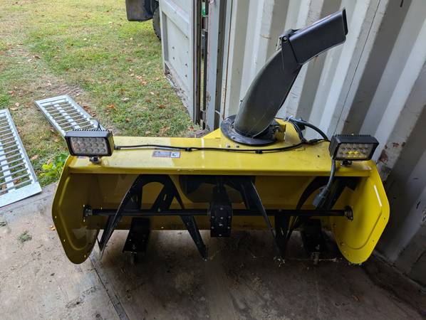John Deere model 47 belt driven snowblower complete with 2 50-pound rear wheel weights, and terragrip wheel belts. Comes with mounting hardware for an X580, X584, and X590 tractor. Does NOT come with the pictured dolly for the snowblower. Snowblower has electric up/down chute and two floodlights mounted on it. Unit has been stored indoors when not in use.