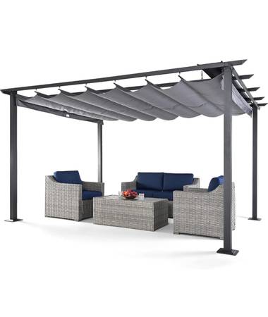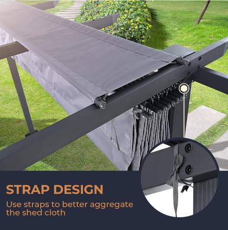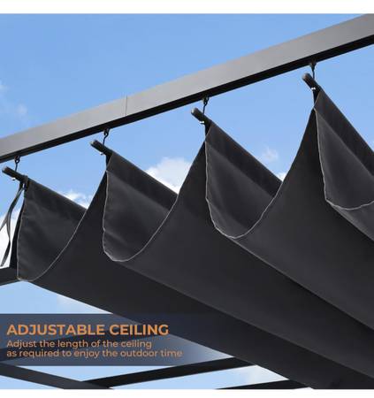 Retractable Top: The pergola comes with a retractable top that can be easily opened or closed according to your preference. The canopy is made of high quality polyester fabric with a tarpaulin top, pull the retractable top under the tarpaulin in case of heavy rain.