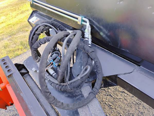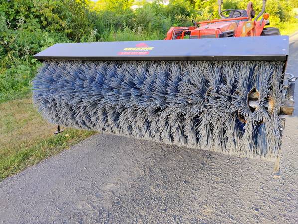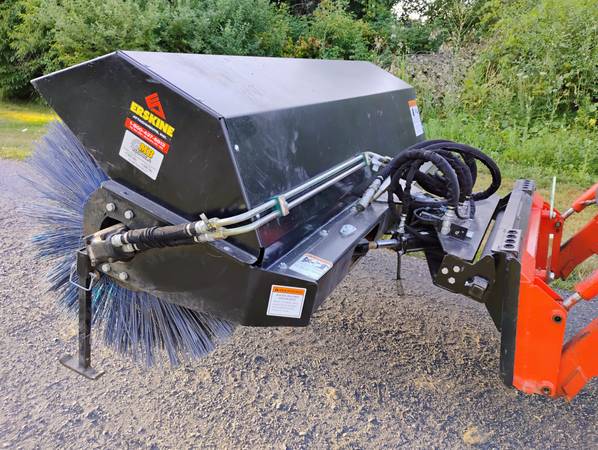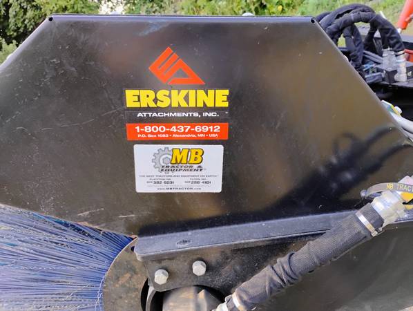 Erskine 84 inch Rotary Broom attatchment for skid steer. Requires 13 to 24 GPM flow rate. Hoses and fittings in very good condition. 32 inch wafers. 40 in all. Power angle 30 degree adjustment right or left. Operating weight 775 lbs. In like new condition. Estate owned and stored indoors. This model is well over 10k new. Pictures show it mounted on a tractor loader. Skid steer only. Just using the tractor to move it around. Asking $3500 obo. No trades.