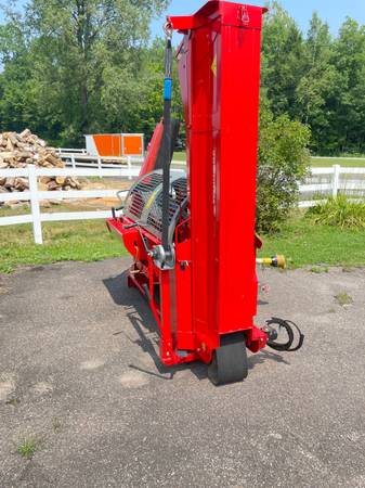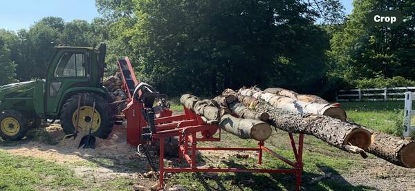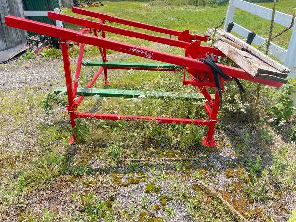 Hakki-Pilke 35 wood processor works on 3 pt hitch and powered by the pto has a16 inch chain saw bar cuts log upto 15 inches in diameter and blocks wood upto 21 inches long comes with a two way splitter head (u can buy a 4 or 6 way splitter head that talked right on ) after it splits the wood it goes up the elevator and piles it there is a Hakki-Pilke 422 log rack that comes with it the log rack has hydraulic feeders to heypull the log into the processor the rack can handle around 20 foot logs asking $15,000. Or best reasonably offer no no trades at all