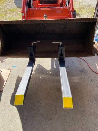 Up for sale is a pair of pallet forks, that fit on a bucket of a tractor. They do have a big mounting area for wider lip bucket. If you have a smaller tractor, I use shims as seen in the pictures to make up the difference. Forks are approximately 29 inches from the nose of the bucket to the tip of the fork. Please look at the pictures and email me if you have any questions.