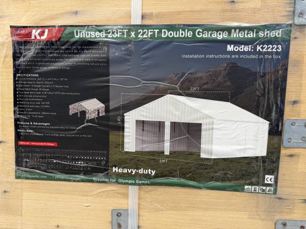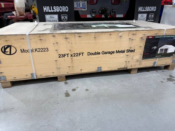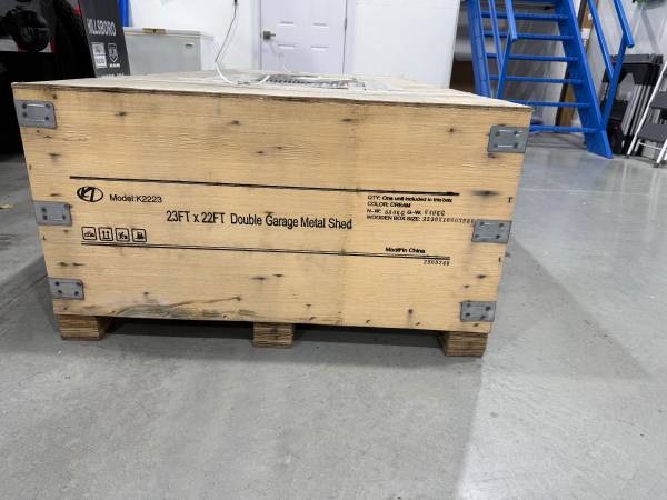 All Steel Structure Double Garage Metal Shed . Kit contains, Steel columns, steel beams, steel roof trusses, connected with bolts and rivets, The roof and walls are made of PPGI board which is galvanized and polyester painted to prevent rust and corrosion. Ideal for car garage , workshop or storage. Storage capacity approx 500 Sq Ft. Main frame 14 Gauge , Sheet metal is 26 Gauge. Two frame doors opennings 8.3 wide x 7.3 high ( without doors ). One side entrance door. Reference Roof Snow load 30 PSF. Reference wind load is 75 MPH. Color - Cream. New unoppend Crate. One available . Loacated at Hillsboro Jeep 03244. Contact greg in Parts @ Tel 603-464-5200. Priced to sell quickly at $2850.