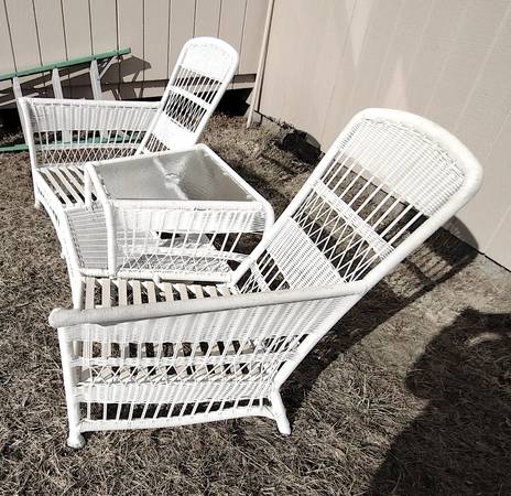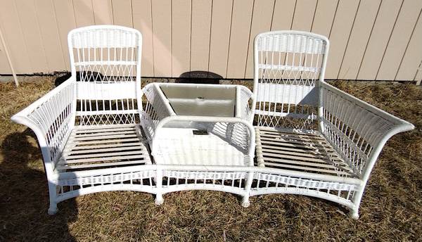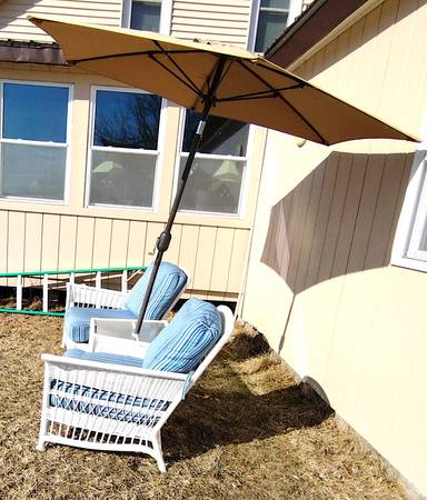 Quality Wicker Conversation Bench With Middle Table, cushions and umbrella Perfect for your patio outside living area or deck 35 1/2" H X 6' W X 23" D