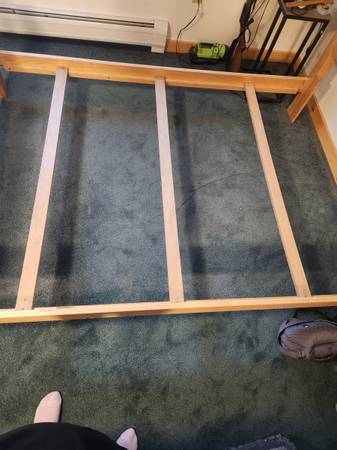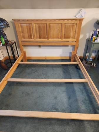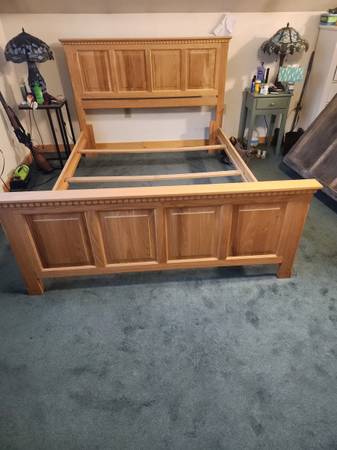 Beautiful solid wood bed frame. Headboard and footboard. Adjustable to full zie or queen size. Excellent condition