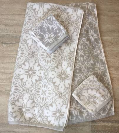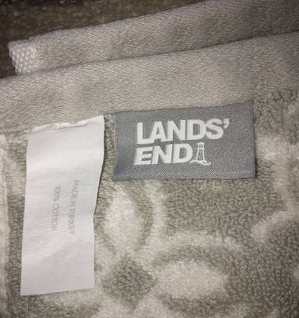 This is a set of 6 bath towels and 8 washcloths from Land’s End. 100% cotton terry cloth, made in Turkey. Quite thick and nice. They are soft gray and white. The pattern reverses, so one side is more gray and one side is more white. Towels measure 54” x 25”. Very clean, no stains.