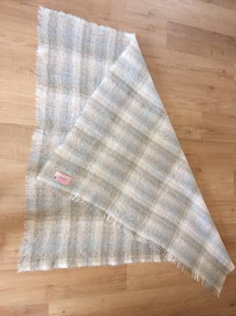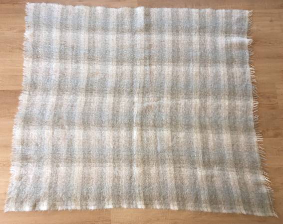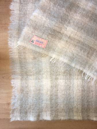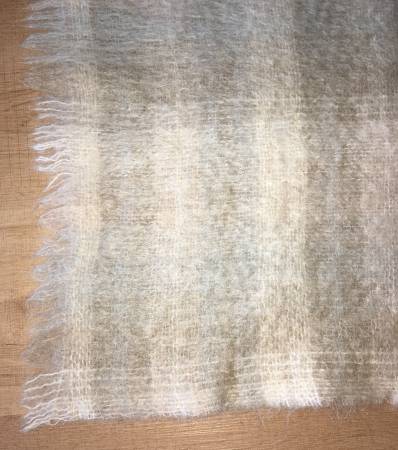 This beautiful throw was made in Ireland by John Hanly & Company, LTD, of Nenagh Co, Tipperary. It is super soft and warm, yet extremely light-weight. Hand-loomed, it is an open weave, which holds heat without being heavy. Nice fringe at the ends. 70% mohair and 30% wool. Colors are cream, tan/light brown and gray. Great for curling up on a couch, or on a cool day on the porch. Measures 63” x 55”. Dry clean only.
