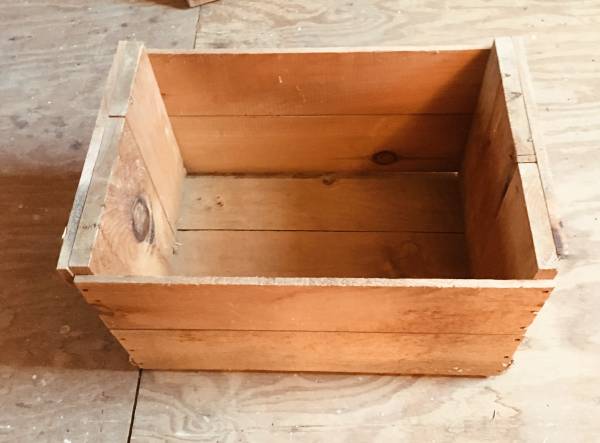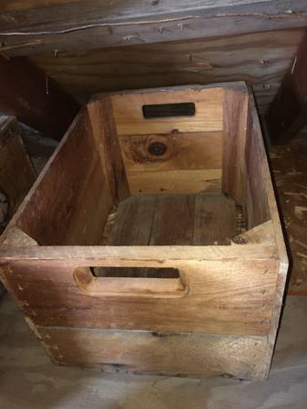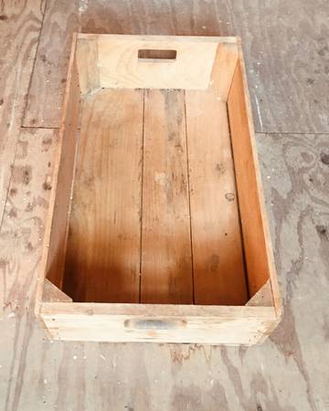 Three wooden crates. These are heavy duty, made of strong wood. Strong enough to hold engine parts or other heavy items. All in excellent, barely used condition. Very sturdy, and nice looking. Two have holes cut for handles, and they are sanded so they are not sharp and are easy to carry. They are excellent for storing or moving heavy things like nails... to a work site, also good for toys, pet stuff, gift packaging, crafts...