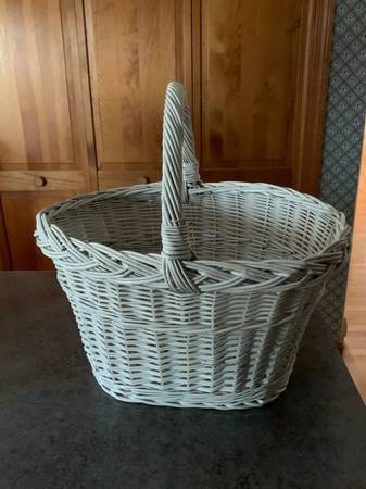 White wicker basket in excellent shape 16 inches long 13 inches wide 10 1/2 inches high including handle 16 inches high. Mutiple uses. From smoke/pet free home. Cash only. Pickup only.
