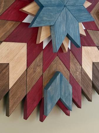 Enhance your home decor with this stunning handmade Barn Quilt layered artwork made from locally sourced spruce and/or pine. Each piece is individually cut, sanded, & stained. It is expertly handcrafted with a vibrant palette of stains. Transform any space with its eye-catching design and quality craftsmanship. Secured on a sturdy backing, this unique piece will add a personal touch to any room your home. Perfect for gifting or complementing your own decor, this art invites creativity and elegance into any room.