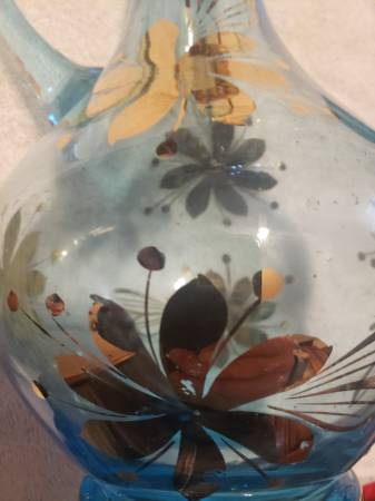 Vintage midcentury 1960s blue green 24K gold overlay wine decanter set