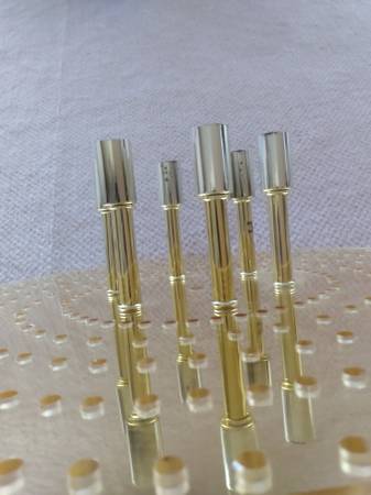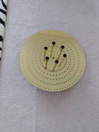 The gold portion of lucite is in excellent to like new condition. The brass up by light sockets does show some wear. Note: All those prisms you see fit in all the little holes in fixture. NOTE: MY FIRST PICTURE IS A PICTURE OF A LIKE FIXTURE. NOTICE HOW THE PRISMS FORM AN OUTER LINE. OURS HAS MULTIPLE ROWS, THE EXAMPLE HAS ONLY ONE. OURS SELLS FOR MUCH MORE, YET PRICE LOW TO SELL. This fixture has all its parts and the wiring in fine shape