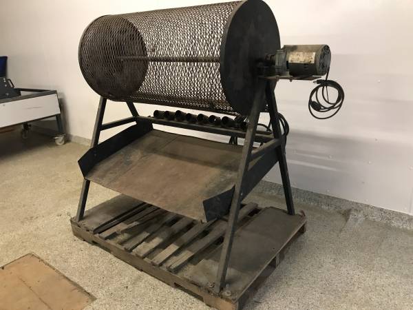motorized pepper roaster with an 48" x 24" drum, 8 burners, and a 110-volt motor is designed for high-volume roasting of chili peppers and other vegetables.