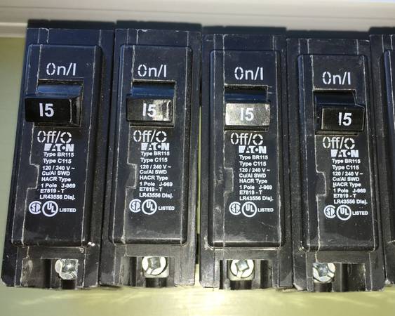 These are Eaton, BR115 15 amp circuit breakers. Four breakers available. Never installed. Clean.