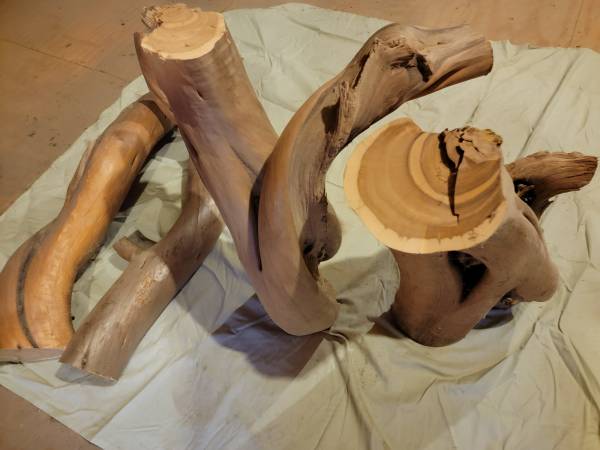 These pieces were purchased and moved from central Oregon fifteen years ago. Western juniper is a rare, dense, twisty wood ideal for carving and display. I envision this group wrapped around each other to form a table base, or re-cut to make four interesting legs. I've take pictures of the pieces from several angles to show various configurations. The piece lengths are 22", 22", 27", and 27". The only source I can find for similar pieces is asking $750-1000 for a finished base: https://highwestwood.com/collections/juniper. I'm offering the group for $125 obo. Email or call Tom (please don't text, I don't check often) at the number provided.