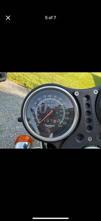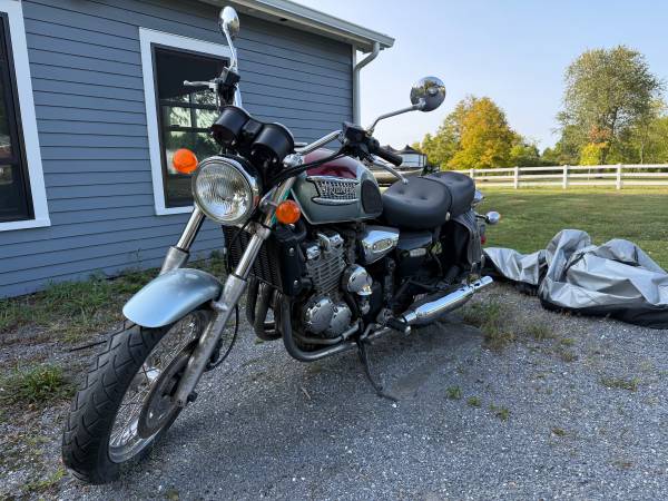 2001 Triumph thunderbird 900. Clean title - 27, 337 miles. Small dent on tank, pictured. I have had it for about 2 years, stored inside all winters. Suspension has been lowered about 1.5 inches using a Lutz lowering kit. I still have the original parts so it can be reversed. There is a wind screen not shown, comes with saddle bags. New electronic ignition module, new ignition switch with two keys. All hydraulic fluids have been changed.