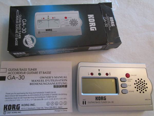 for use as a handy stand. In the Box is the GA-30 Guitar and Base Tuner, Owner's manual Two AAA batteries.