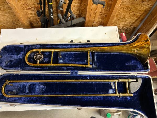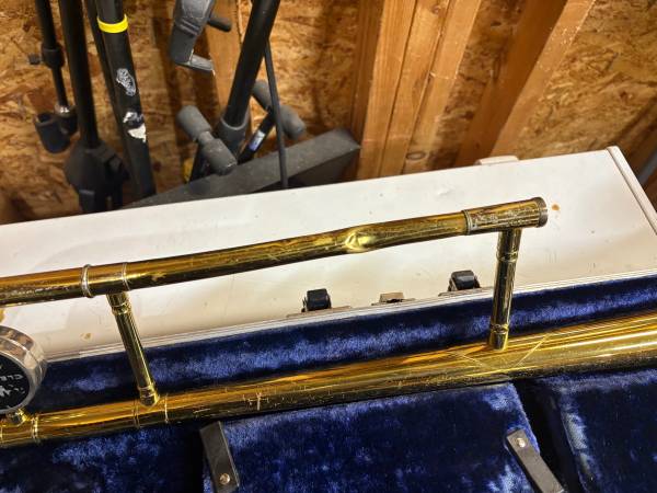 King 605 trombone. Pre-reliced so your student doesn’t have to. Lacquer is distressed and several dents .. neither of which effect playability. Case has a hole but clasps, hinges and internal parts...