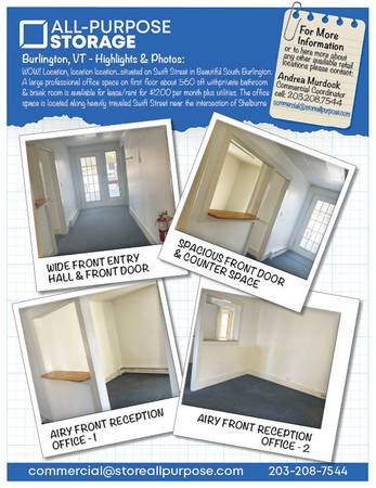 WOW! Location, location location...situated on Swift Street in Beautiful South Burlington. A large professional office space on first floor about 560 sft withprivate bathroom & break room is available for lease/rent for $1250 per month plus utilities. The office space is located along heavily traveled Swift Street near the intersection of Shelburne Road & US Route 189 in South Burlington. 10 min drive to downtown Burlington, Shelburne, 15 min to Winooski or Williston. Ample guest parking on site.