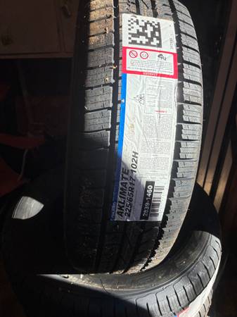 Set of four brand new Falken Aklimate 225 65 R17 tires. These tires have never been on a vehicle and or balanced on rims. I purchased them last year to go on a my Rav 4, but traded that vehicle in. Brand new with stickers, cost $ 650. $400 obo takes them. They are all weather, not all season and are rated for rain, mud and snow. Winter is approaching and these could be yours for a fraction of what a tire shop would charge.
