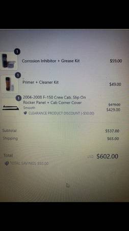 For sale: 1) a set of OAM quick covers for FORD F-150, fits 2004-2008 crew cab. Covers are still in the box and only opened to see the product. 2) Corrosion inhibitor and grease kit. 3) Primer and cleaner kit. 4) Two cans of FORD OEM white to paint the covers.