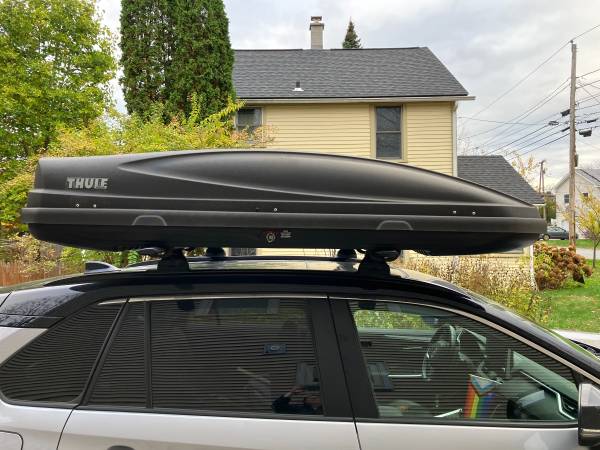 newer model Thule cargo box fits on top of most roof racks. Clamp style attachment, locks on eother side depending on which side of the vehicle you want to mount it on. Clean, functional and rarely used. Height = 14 inches, width = 24 inches, length = 6 feet.