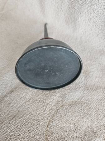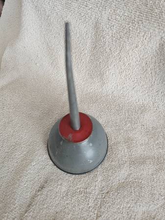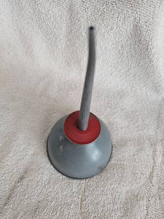 This vintage oiler can has a red collar, stands 7 tall and is 3.5" in diameter.