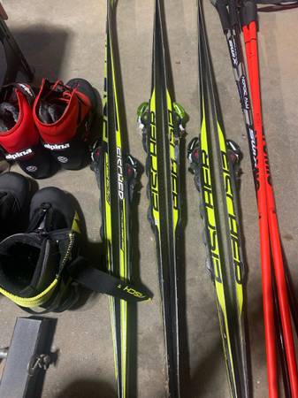 1 set of skis and 2 boots. BOOTS Fischer jr combi size 38 Alpina size 35 SKIS Fischer sprint skis 140cm Email and we can connect by text once Im confident youre not spam.