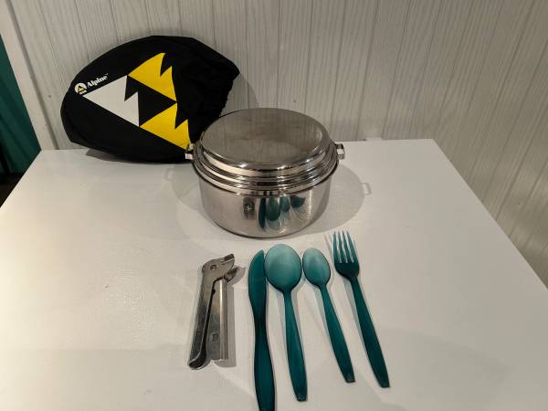 Stainless steel two pot set with stainless steel double walled mug and plastic utensils. Excellent condition. $20