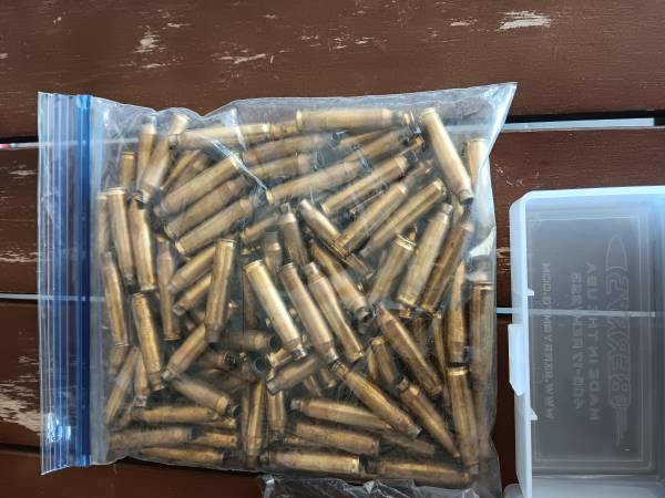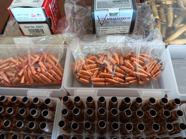 100 HORNADY V-MAX .224/22CAL 55GR. 100 NOSLER ARMAGEDDON .224/22CAL 55GR. 300 ONCE FIRED 223/5.56 CASES. 4 AMMO STORAGE FLIP TOP BOXES 50RD. Asking $50 Email for more Pictures or information.